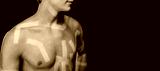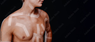 Strong man's arm sunburned with white stripes. Kinesio taping and healthy male concept with copy space