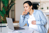 Focused smart confident beautiful pregnant mixed race woman working on laptop at at workplace, taking break, thinking about business project or vacation, looking away, takes off glasses,stroking belly