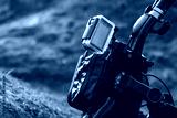 Action Camera on a bike with a bikepacking bag in a waterproof case against the backdrop of nature.
