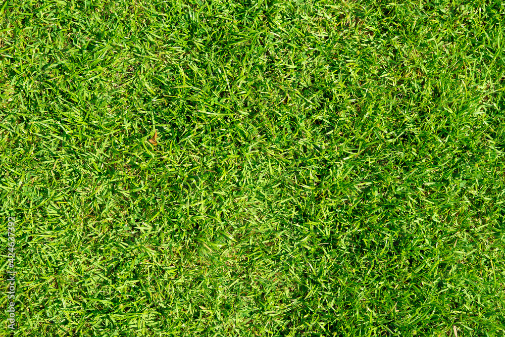 Texture background of green grass is used to make sports fields such as golf, soccer, football and gardening. Close-up.