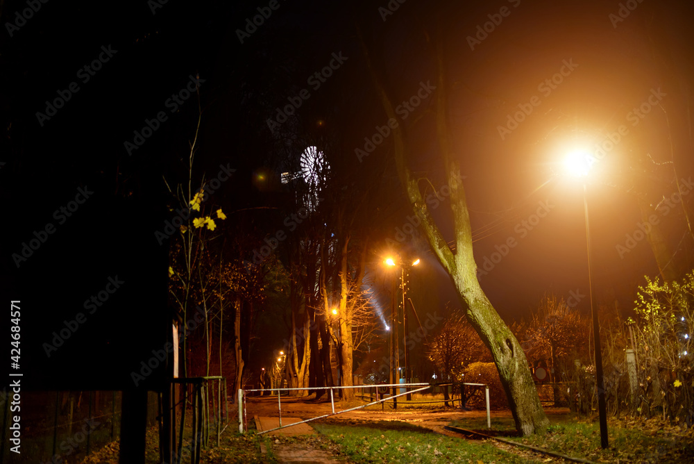 The road to the evening autumn park is closed for passage by a barrier