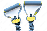Two grey and yellow handles of latex resistance band scrunched in nylon safety sleeve. Sport. Equipment. Gym. Training. TRX. Home. Rubber expander