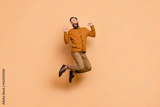 Full body portrait of astonished man fists up open mouth celebrate isolated on beige color background