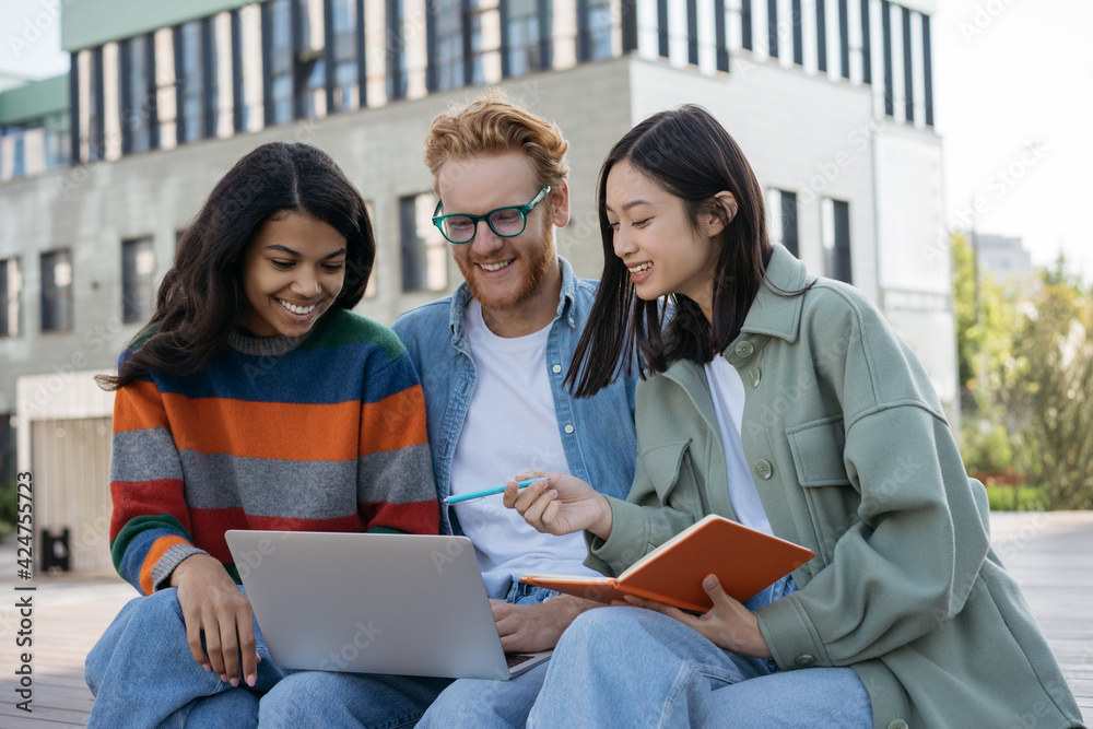 Smiling colleagues meeting, cooperation, planning start up project, working together outdoors. Group of multiracial university students using laptop, studying, exam preparation, education concept