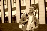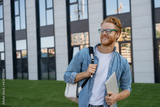 Portrait of happy confident man wearing eyeglasses looking away, copy space. Smiling university student with backpack and laptop computer walking in university campus, education concept