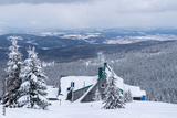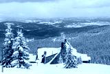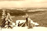 Winter mountain landscape, Poland, Panorama of the Giant Mountains in sunny winter day, from Biała Dolina in Szklarska Poreba on Szrenica and Sniezne Kotly, blue sky, white and dark clouds. Snow cover