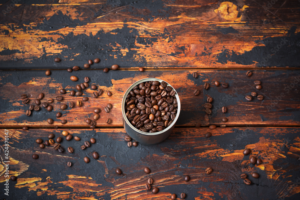 Blended coffee beans in a tin can on a rustic wooden table among scattered coffee beans, blended, vintage, top view