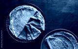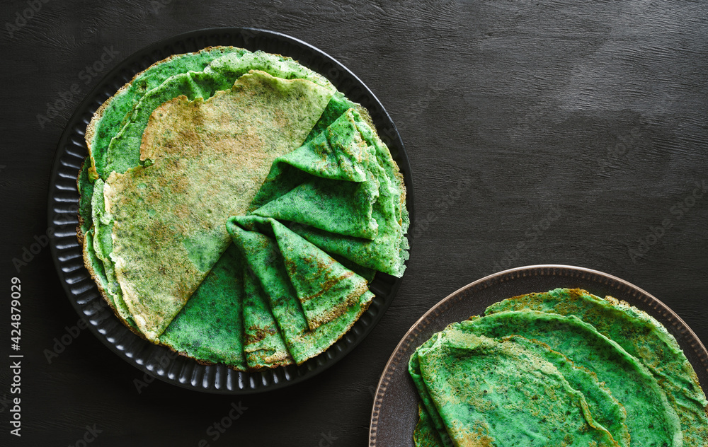 Green vegan crepes with spinach or pancakes on black plate over dark wooden background. Healthy food, vegetarian, homemade breakfast, top view