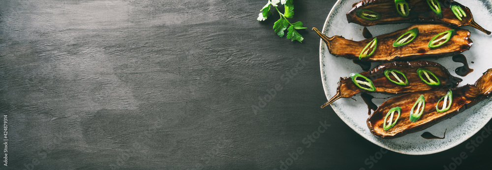 Grilled eggplant with spicy sauce on plate over black wooden background. Healthy food, vegan, top view, toning