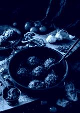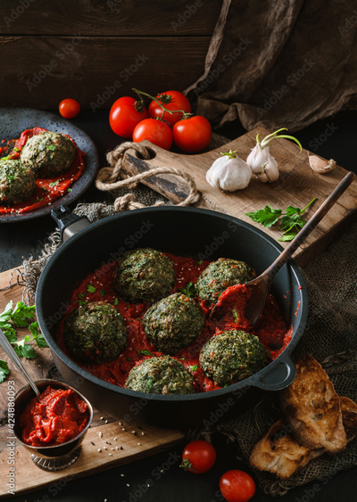 Vegan spinach balls or cutlets with chickpeas in pan with tomato sauce and herb on dark wooden background. Healthy food, clean eating, vegetarian diet, close up