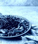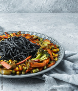 Black spaghetti or pasta from seafood with grilled vegetables, broccoli, corn, green peas in plate on light gray background. Wholemeal pasta, healthy vegan food, close up