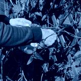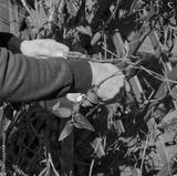 Gardener prunes a creeper on a pergola using a spring scissor in the garden