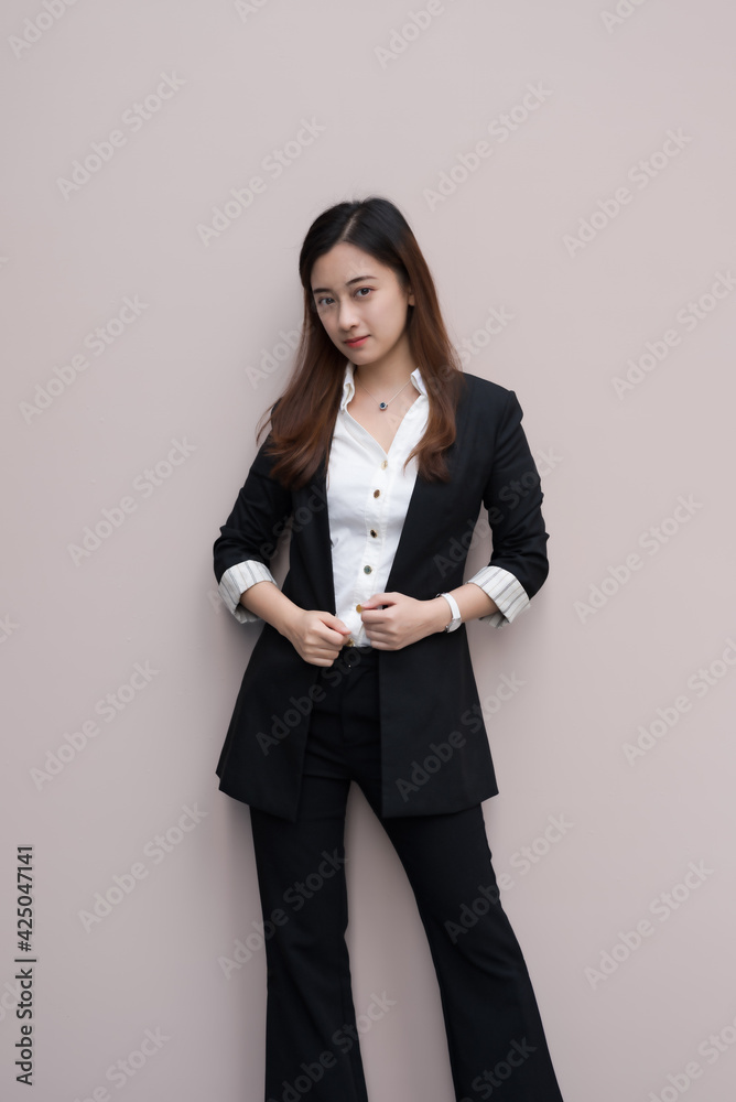 A young asian woman in black suit.