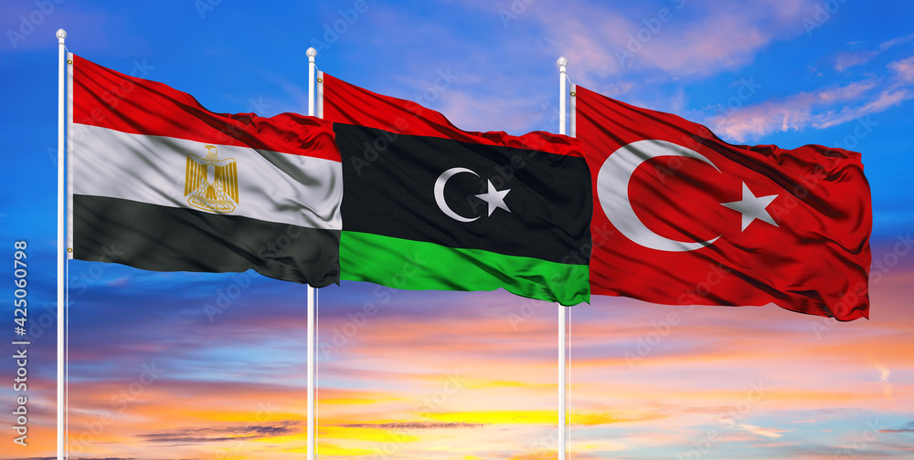 The flags of Egypt, Turkey, and Libya flutter in the sky, the concept of conflict in the Libyan state