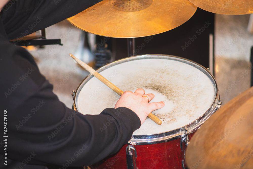 Musician playing drums. Concert drum set