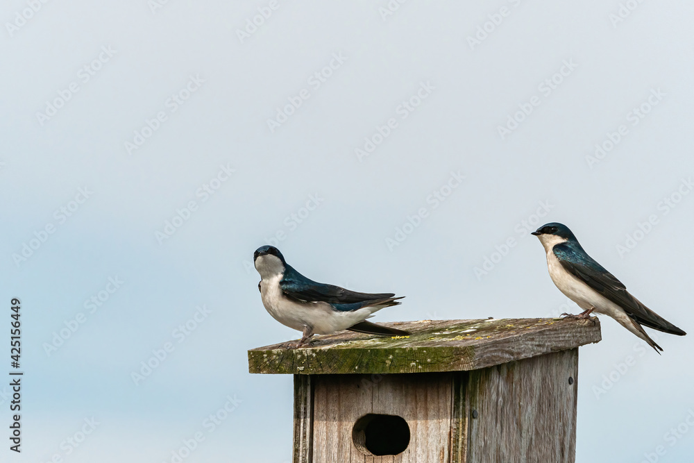 two beautiful swallows with blue feather resting on top of the birdhouse on an overcast day