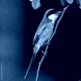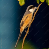 Long-tailed shrike perching on the tree branch with dark blue background.
