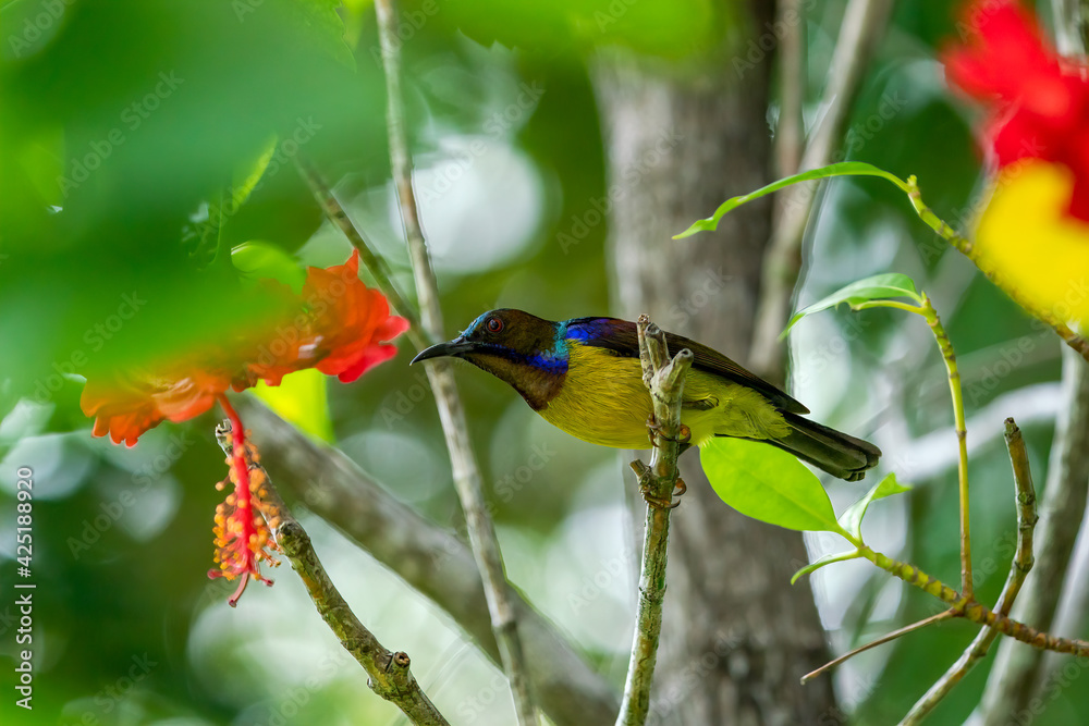 Male Brown-throated sunbird reaching out toward the Hibiscus flower.