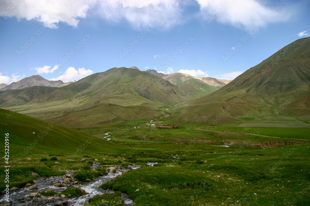 Scenery of alpine pastures near Song Kol in Kyrgyzstan