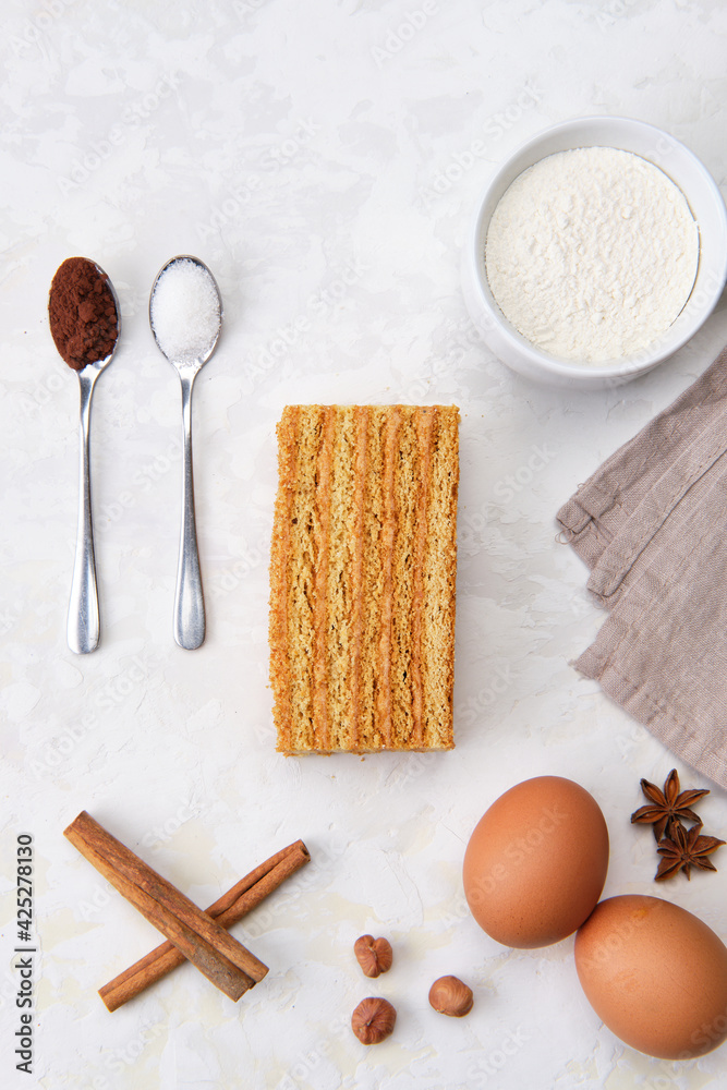 Top view of a piece of cake. Ingredients for cooking cake. Flat style.