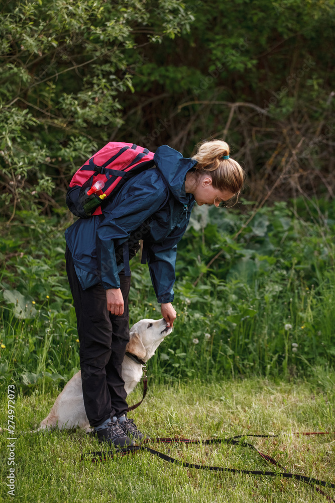 Retriever wearing wreath made of beautiful white flowers on white background looking at camera