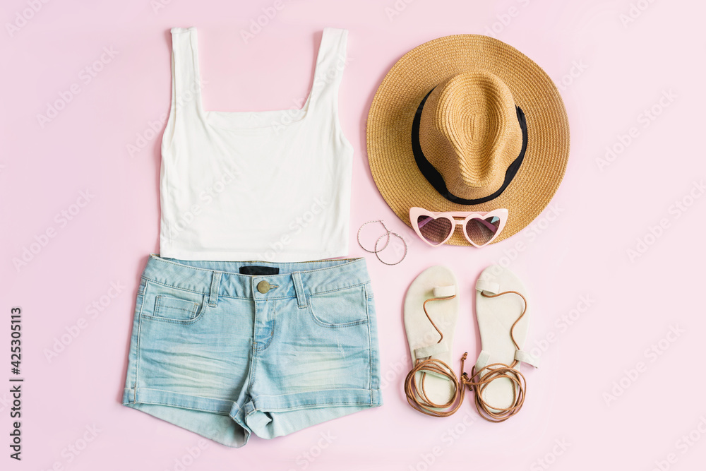 Fashion summer women's clothes set with accessories on pink background, Flat lay, Top view