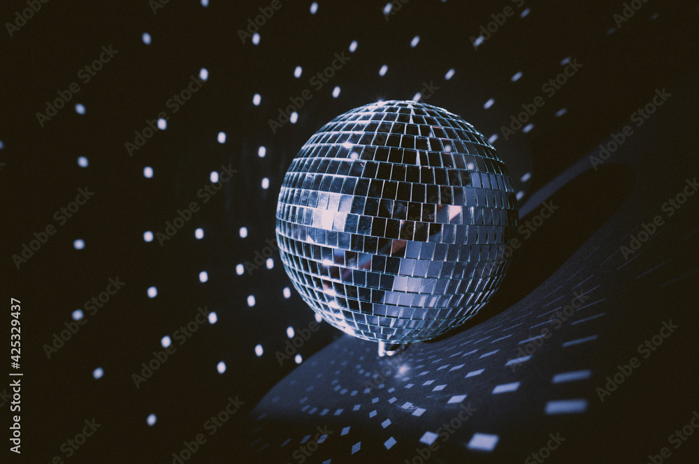 Illuminated by sun light silver disco mirror ball. Dark black background and cold blue and purple shadows. Party classic decoration. Boho style decor