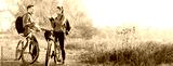 Wide aspect ratio, panoramic photo of a young Caucasian man and woman eating energy bars and talking while resting from a mountain bike ride in countryside