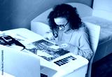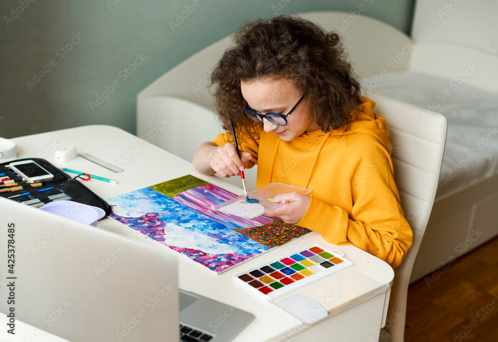 Caucasian teenage girl is drawing with paints sitting at the table. Online distance education concept.