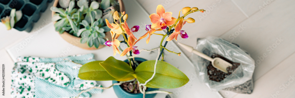 Gardening at home indoor repotting of orchid flowers in new planter with garden tools. Leaf propagation of succulents banner panoramic.