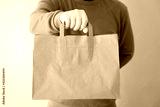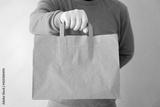 Cropped image from a man holding take away paper bag from delivery. Food delivery concept. Coronavirus quarantine concept