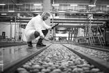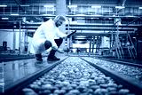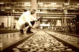 Technologist with tablet computer standing by water tank conveyers doing quality control of apple fruit production in food processing plant.