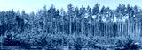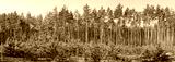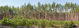 Plantation of young pines against the old trees in forest
