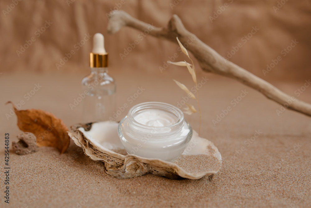 Caring cosmetics in an oyster shell on the sand. Eco-friendly organic cosmetics.