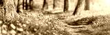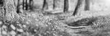 Road in the forest with beautiful yellow dandelions on the both sides.