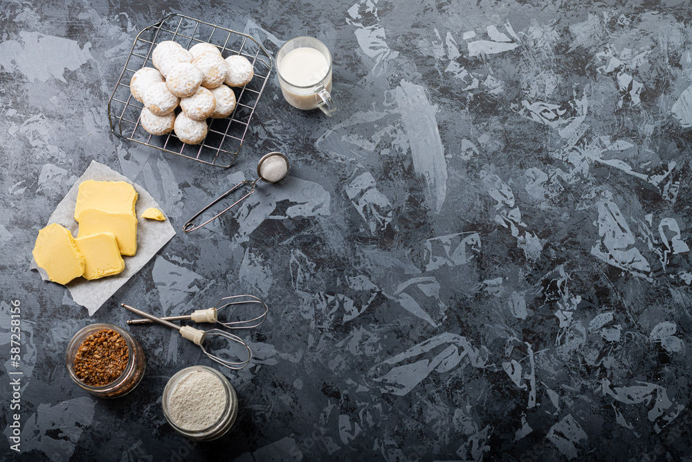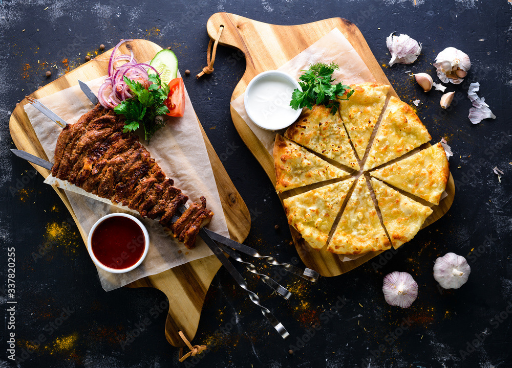 Eastern sweets with nuts, candy, metal vase, tea, dates on wooden background, closeup