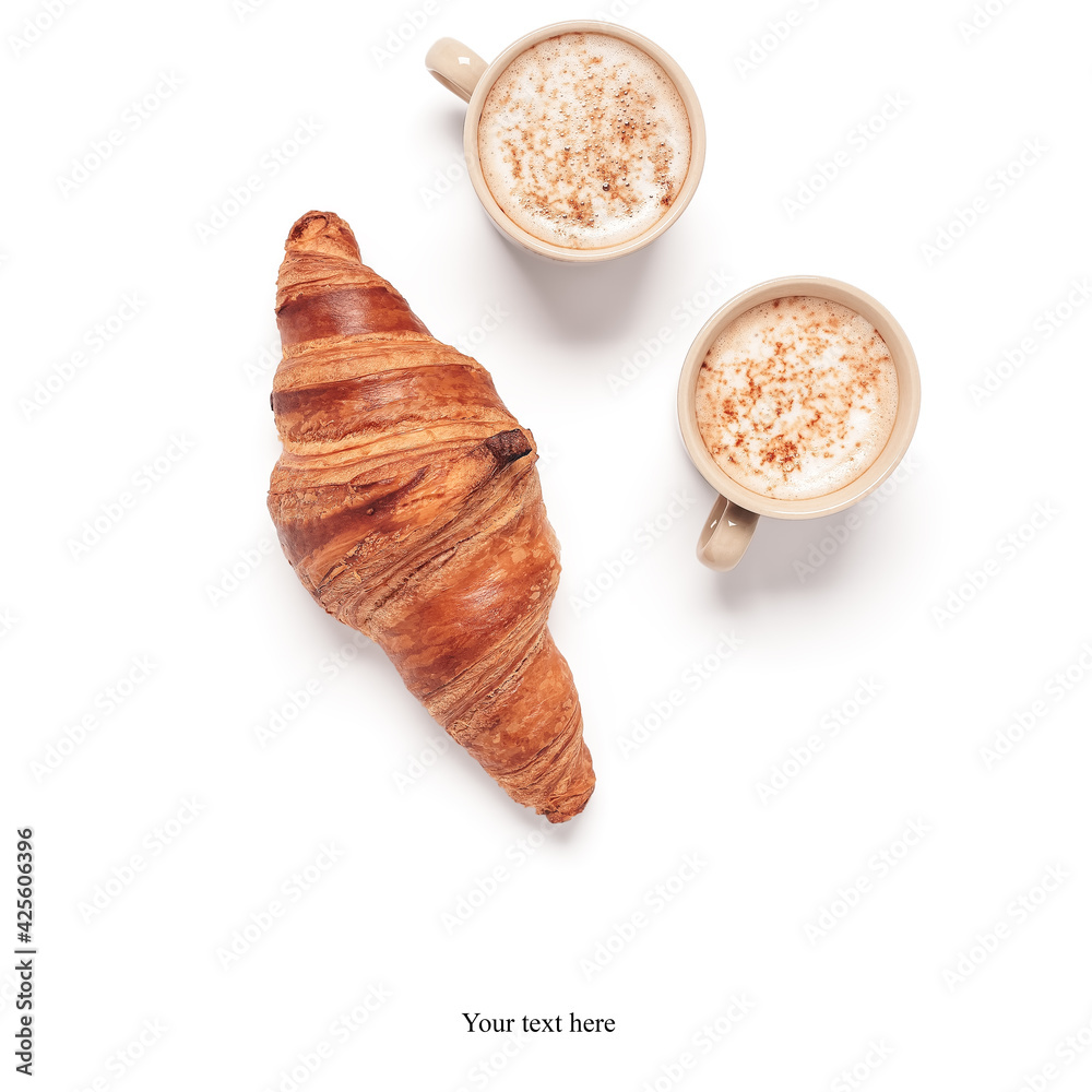 Fresh croissant and coffee cups isolated on white background. Breakfast concept. Creative layout. Top view, copy space.