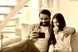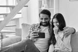 Happy indian father with teenage child daughter having fun using smart phone at home. Smiling dad and teen kid girl watching funny video, laughing at mobile apps sitting on sofa in living room.