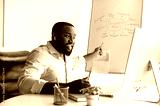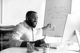Handsome confident influential african american business coach with beard conducts online training for colleagues or students sitting at table and pointing at flipchart while look at computer screen
