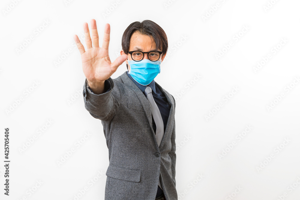 Portrait of a middle-aged Asian businessman wearing a blue face mask on white background. Covid19, Health, and Business Concepts.
