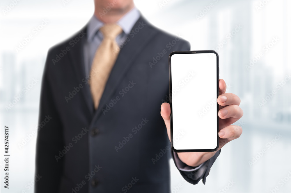 businessman showing phone. Businessman shows cell phone with blank screen. Man hand hold smart mobile cell phone with blank white screen. blurred office background
