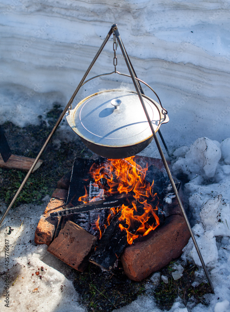 Over the fire hangs a pot in which to cook food. On a hook on a tripod, steam comes out of the pan. Winter Camping outdoor cooking