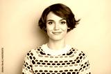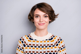 Close-up portrait of nice lovely cheerful brown-haired girl wear ornament sweater isolated over grey pastel color background