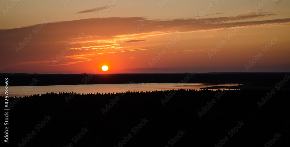 Colorful sunset on lake Usma in Latvia. Above the tops of the trees.