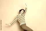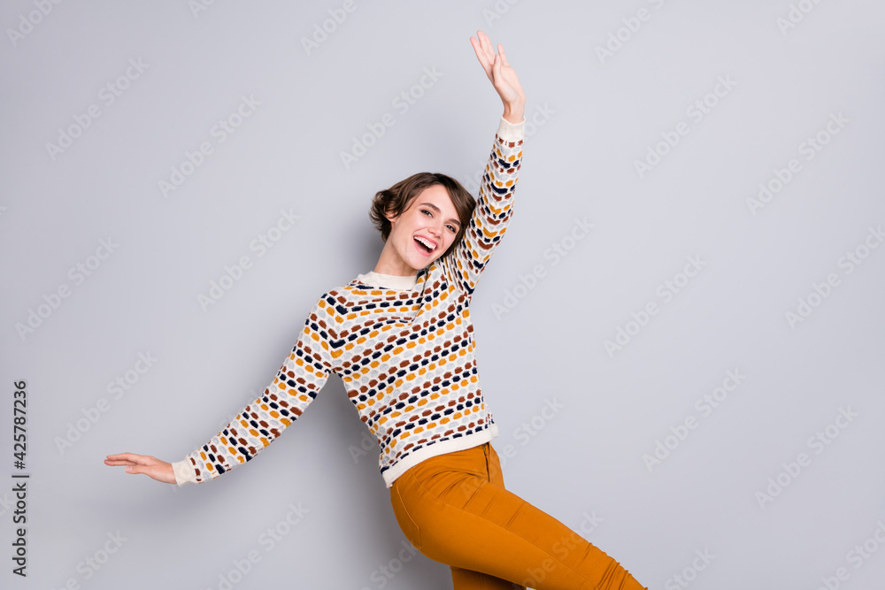 Portrait of pretty cheerful girl dancing having fun rest relax isolated over grey pastel color background