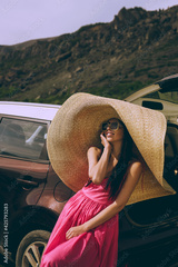 Young beautiful girl in a dress and a wide-brimmed hat near a hatchback car on a background of a mountain landscape.