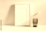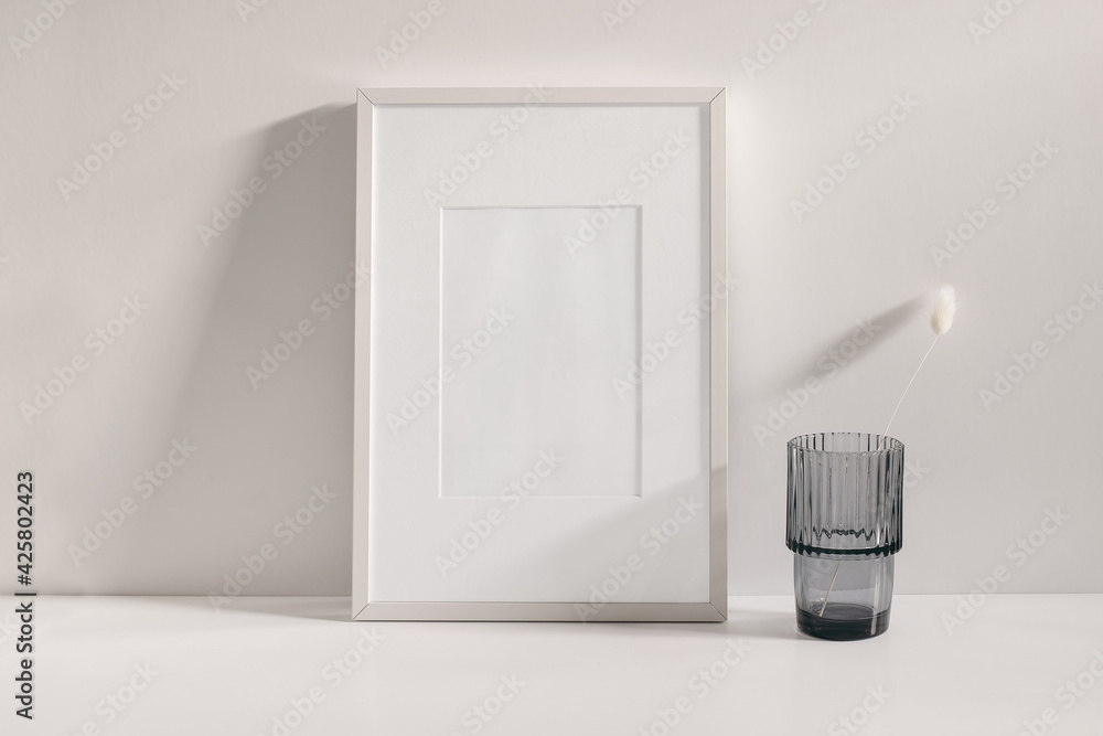 Modern summer artistic still life scene. Grey rippled glass vase with dry lagurus, bunny tail grass. Table background in sunlight. Blank white picture frame mock-up. White wall, long shadows.