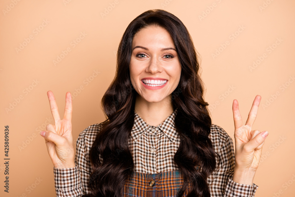 Portrait of charming glad cheerful wavy-haired girl showing double v-sign good mood isolated over beige pastel color background