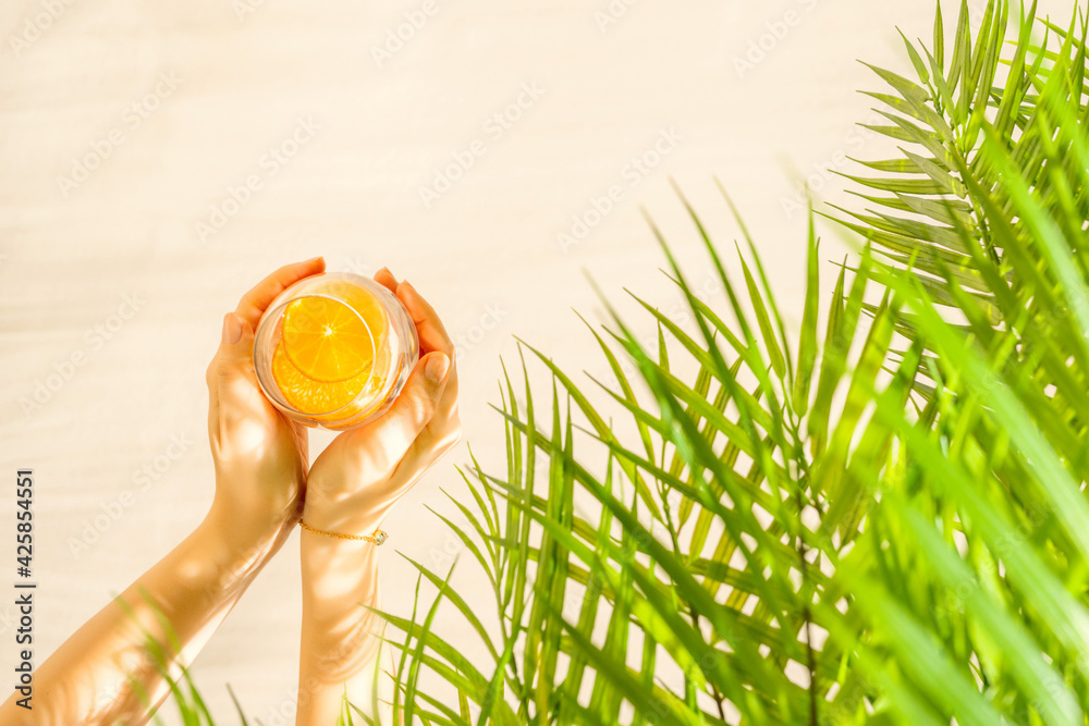 Woman hand under palm tree branches with glass of water with slice orange. Female relaxation on the sand of the beach at summer vacation. Top view