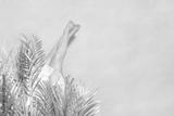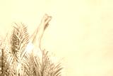 Alone woman in straw hat sitting under palm tree branches. Female relaxation on the sand of the beach at summer vacation. Top view